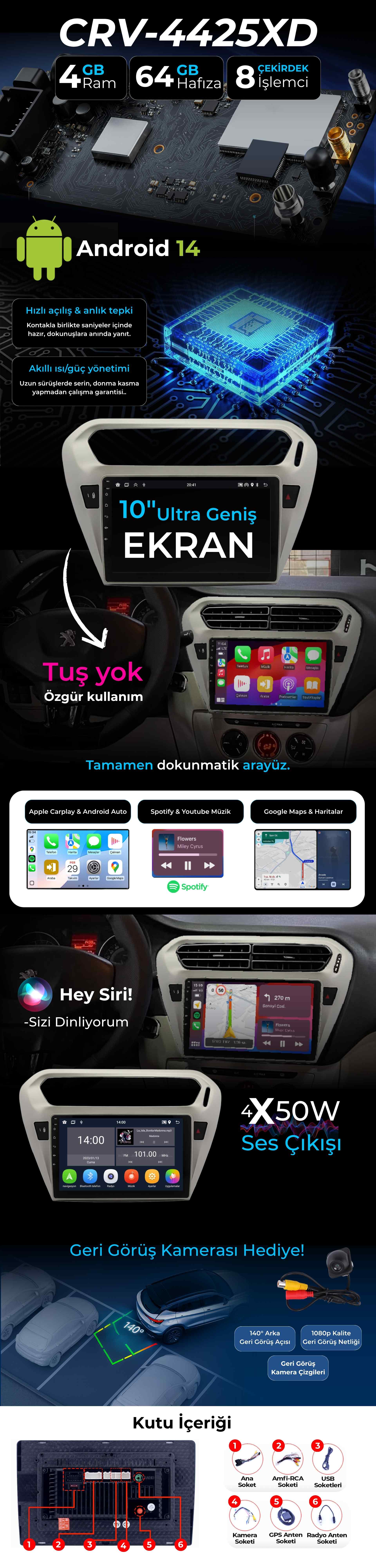Android 14 - 4 GB Ram - 64 GB Hafıza - Carplay & Android Auto - Geri Görüş Kamerası